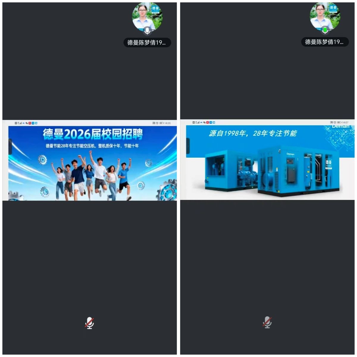 招聘会依托腾讯会议平台开展,德曼压缩机人力资源总监率先通过技术短片展示企业核心竞争力:作为中国第一台永磁变频空压机发明者,其自主研发的“永磁变频二级压缩技术”节能率达30%-50%,入选工信部节能技术装备推荐目录,并位列榜首。技术负责人重点解读电气工程师、智能运维工程师等6类核心岗位需求,针对信息工程专业特色,详解“德曼云”远程智慧管控系统的人才能力要求,该系统已实现设备故障24小时智能响应。