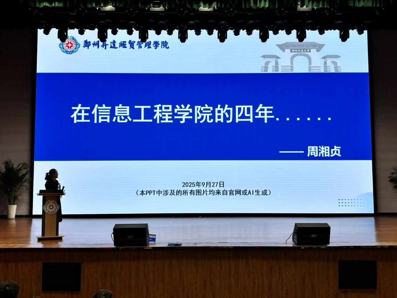 最后,院长周湘贞教授以《在信息工程学院的四年……》为题致辞。她深度解读了学院在学科建设、师资力量、科研平台方面的优势布局,剖析信息工程领域的前沿机遇与挑战,从“学业深耕、思维开拓、创新实践”三个维度为新生规划大学四年成长路径,寄语学子“以初心立学、以笃行练能、以创新破局”,成长为适配时代需求的高素质信息人才。