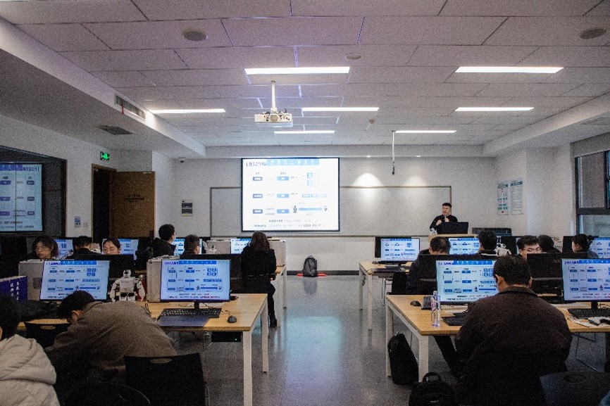 在实践教学环节,张峰在实训大楼A104教室开展实操培训,指导参会教师体验通用模型接入、机器人语义理解及视觉语言模型应用等实操内容,提升实践教学能力。