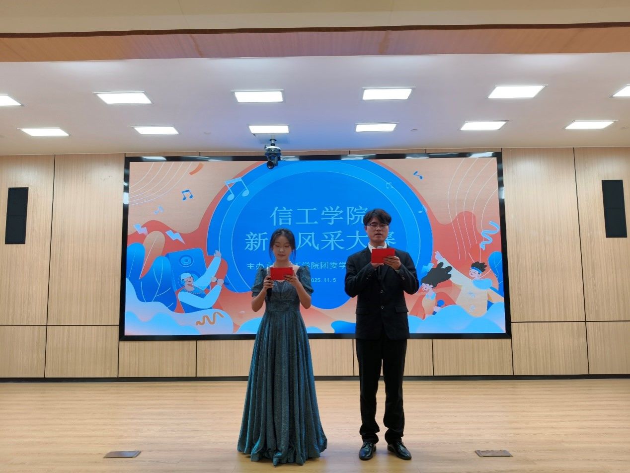 2025年11月13日晚6时30分,新图书馆2楼1号报告厅内灯光璀璨、掌声雷动,信息工程学院风采大赛决赛在此精彩启幕。来自学院各专业的12组选手齐聚舞台,以歌声、表演为笔,绘就了一场青春洋溢的视听盛宴。