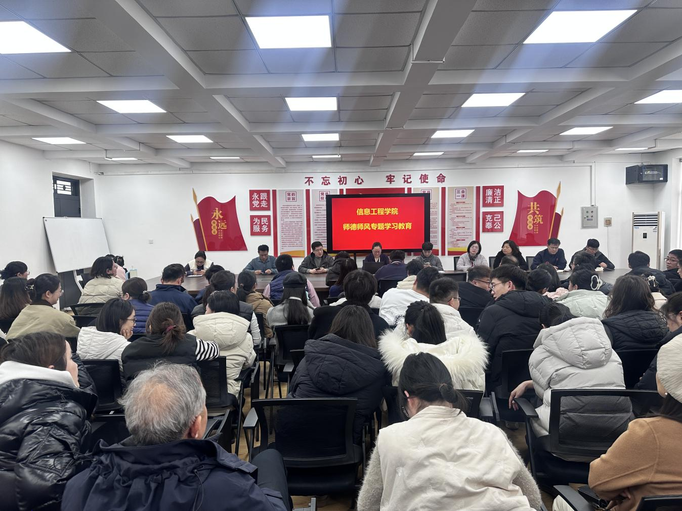 为深入贯彻落实学校关于开展师德师风专题学习教育的部署要求,进一步强化教职工职业道德建设,规范从教行为,筑牢师德底线,信息工程学院于2026年1月14日在学院会议室召开师德师风专题学习教育会。会议由院党委书记钟江鸽领学,院长周湘贞、院党委副书记王崇、副院长罗长远、教学秘书赵会燕及全体教职工参加会议。