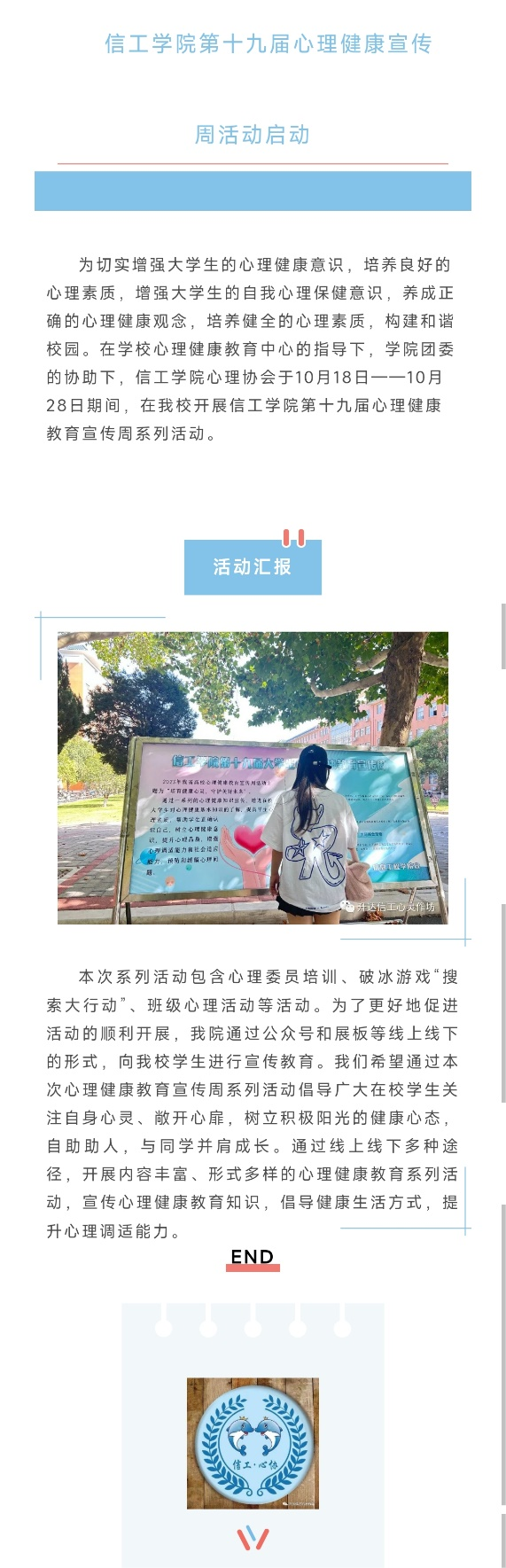 为切实增强大学生的心理健康意识,培养良好的心理素质,养成正确的心理健康观念,构建和谐校园。在学校心理健康教育中心的指导和学院团委的协助下,信工学院心理协会于10月18日——10月28日期间,在我校开展信工学院第十九届心理健康教育宣传周系列活动。