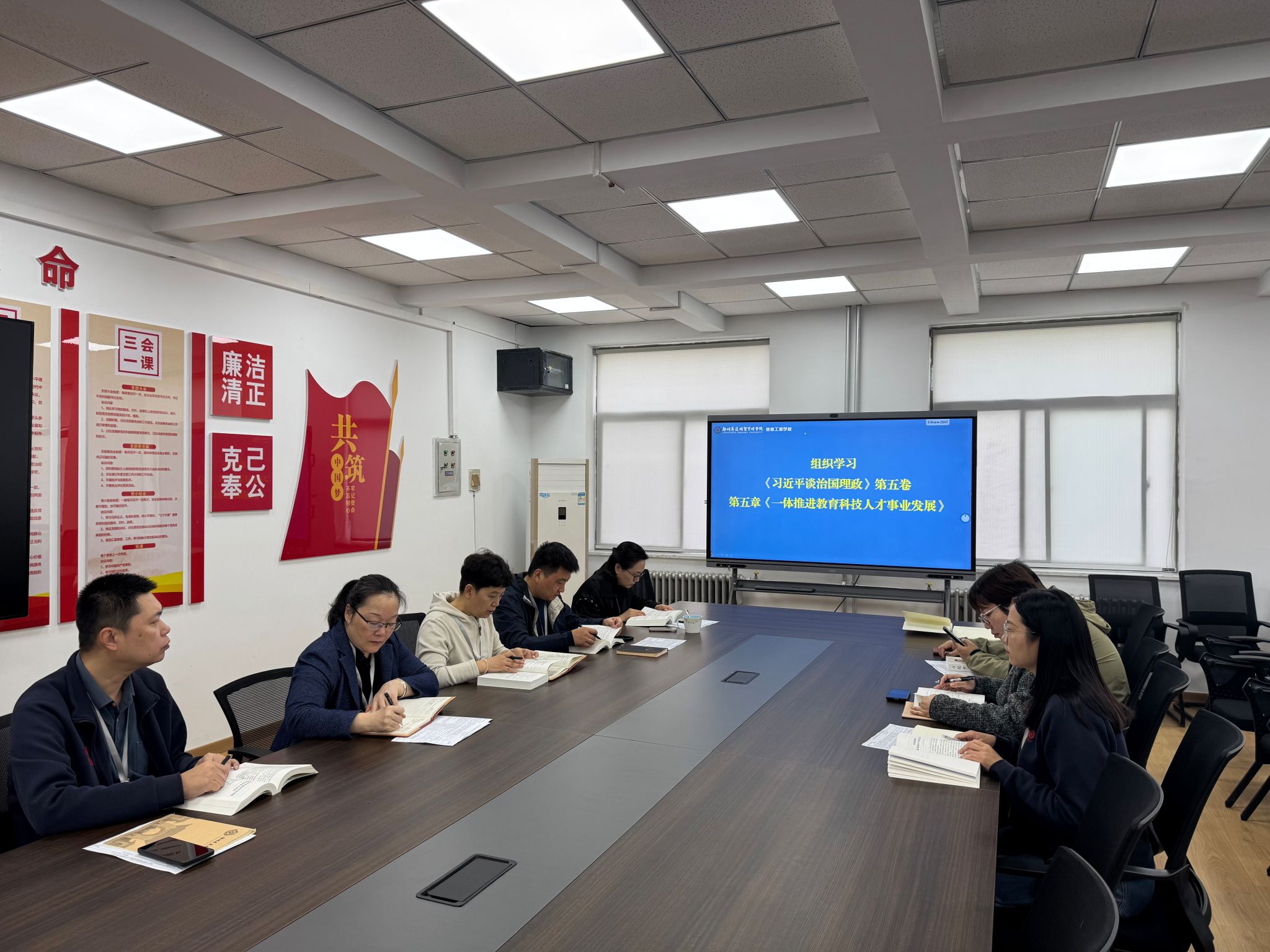 会上,全体成员集中学习了两项重要内容。一是集体学习《习近平谈治国理政》第五卷第五章《一体推进教育科技人才事业发展》,深刻领会教育、科技、人才在国家发展中的重要战略地位以及三者之间的协同发展关系。二是组织学习习近平总书记在主持二十届中共中央政治局第二十二次集体学习时的重要讲话,此次中共中央政治局集体学习围绕系统推进我国宗教中国化展开,习近平总书记强调了宗教中国化的重要性,明确了引导宗教与社会主义社会相适应的要求,加强党对宗教工作的领导。