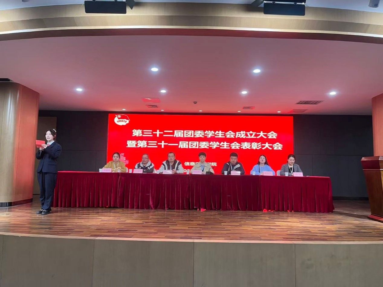 2025年10月28日下午1点,信息工程学院第三十二届团委学生会成立大会暨第三十一届团委学生会表彰大会在双创大讲堂隆重举行。学院党委书记钟江鸽,党委副书记兼团委书记王崇,团委常务副书记袁奉亚、杜自平,各年级团总支书记王建红、赵征、高珊珊及新生班辅导员出席了会议,全体团学成员参会。