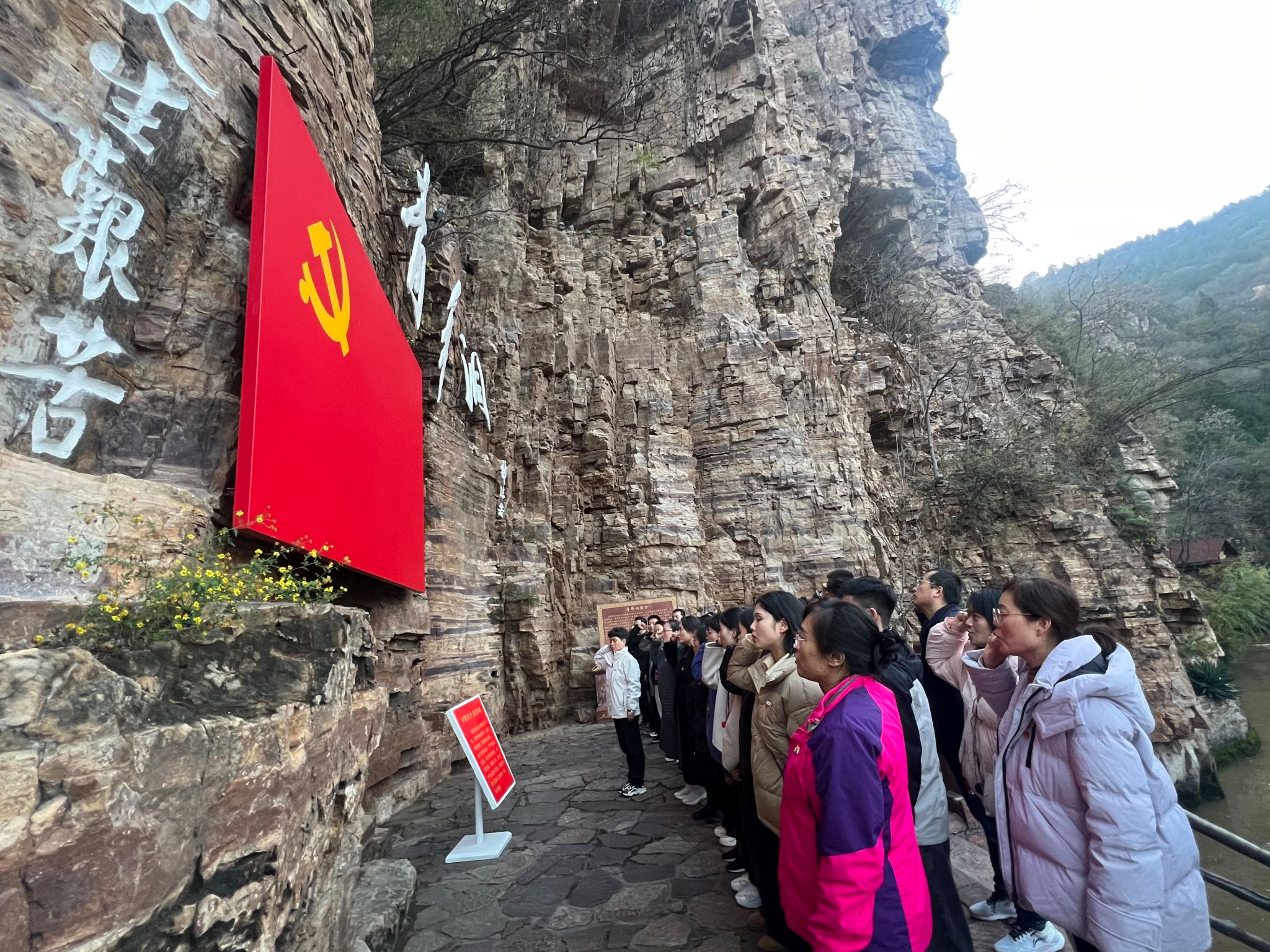 活动期间,党员们先后走进红旗渠纪念馆、青年洞、分水闸等核心教学点,通过现场观摩、实地考察重温建渠岁月。在红旗渠纪念馆,珍贵的史料、生动的场景再现让大家深刻感悟“自力更生、艰苦创业、团结协作、无私奉献”的红旗渠精神内核;青年洞前,党员们重走“创业路、红飘带、水长城”,面对党旗庄严重温入党誓词,坚定初心使命。