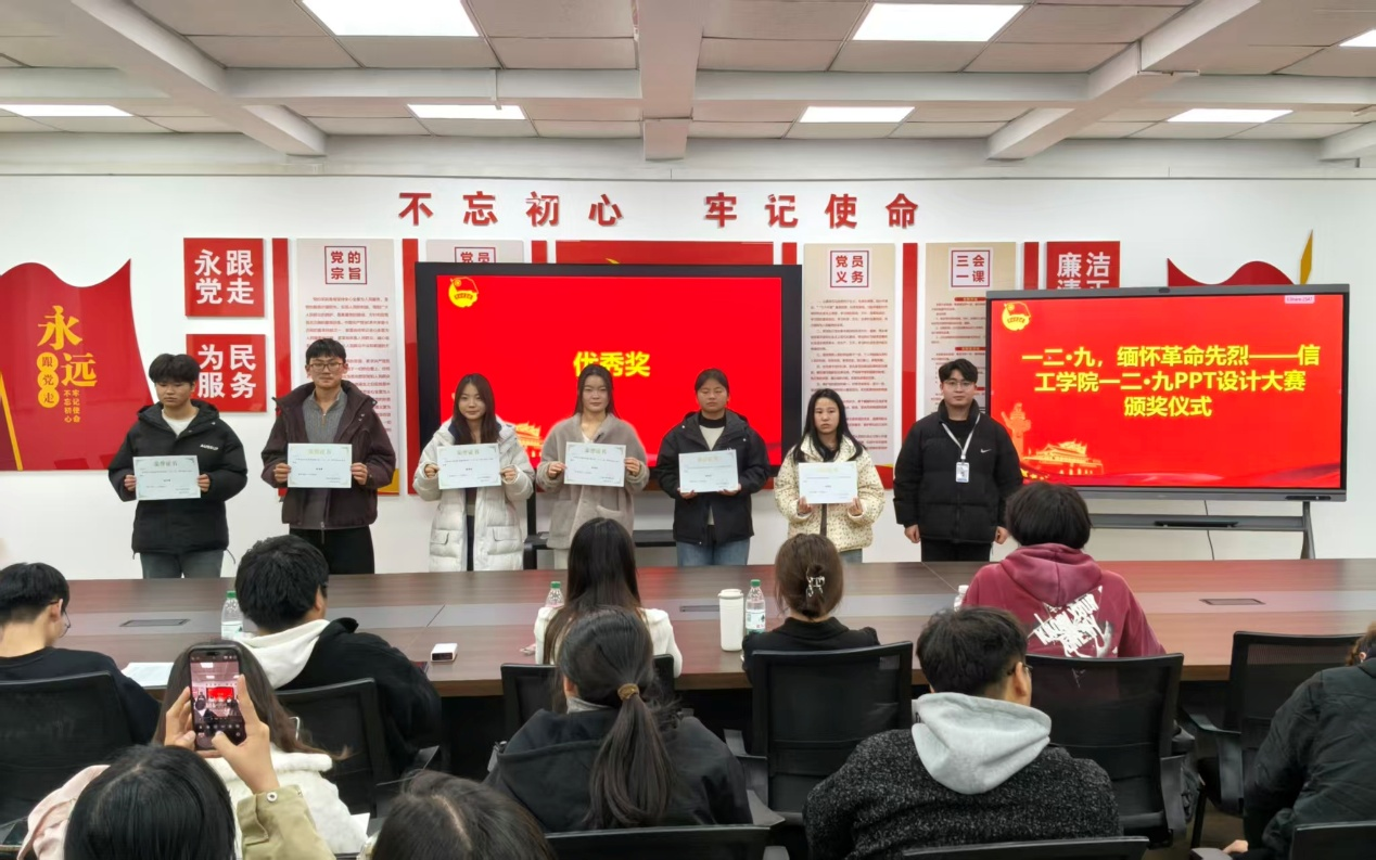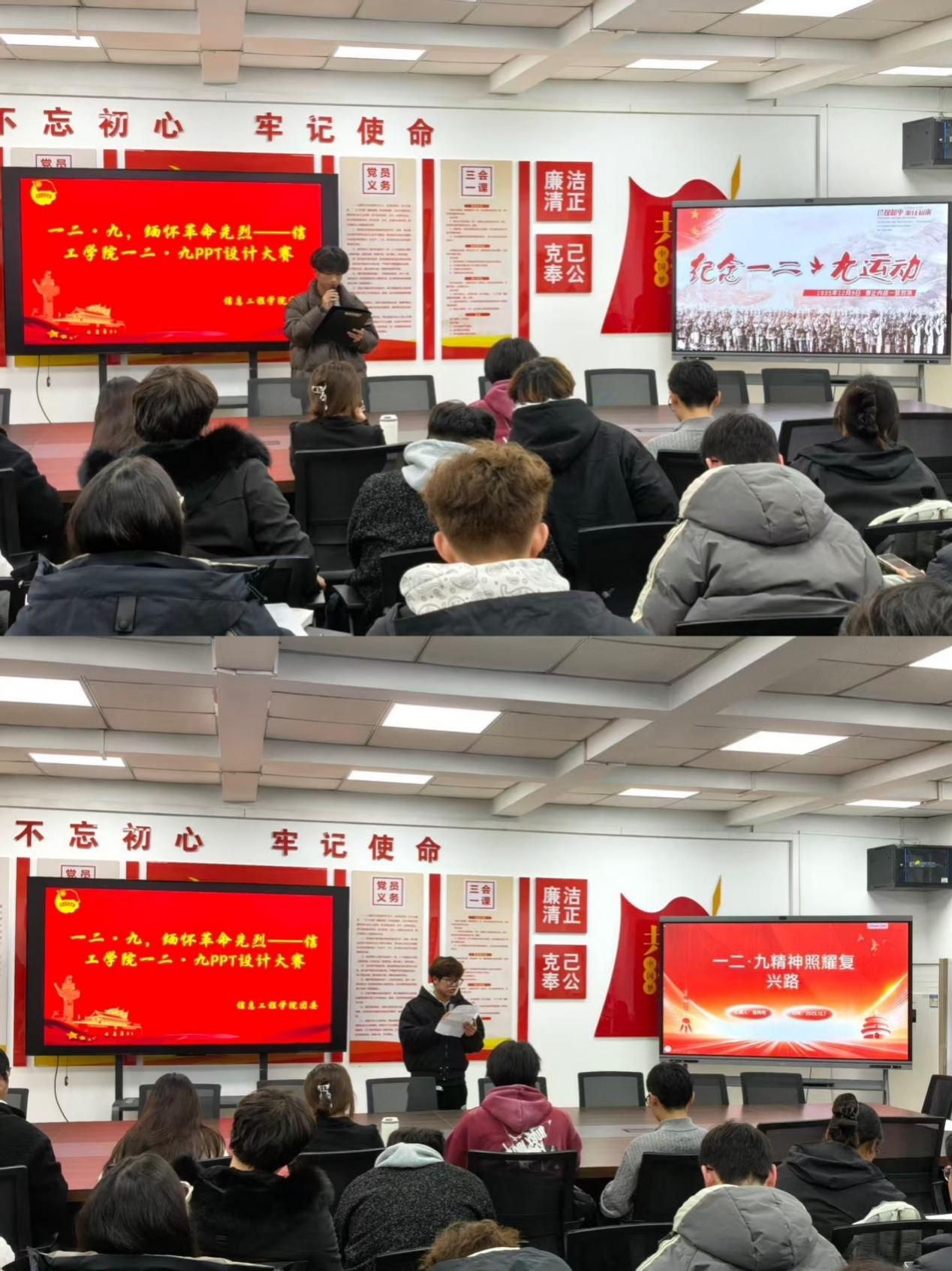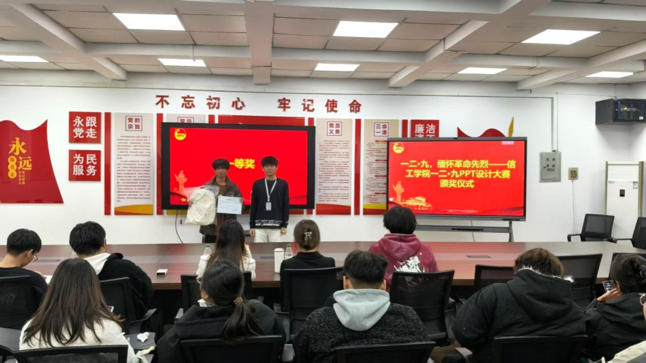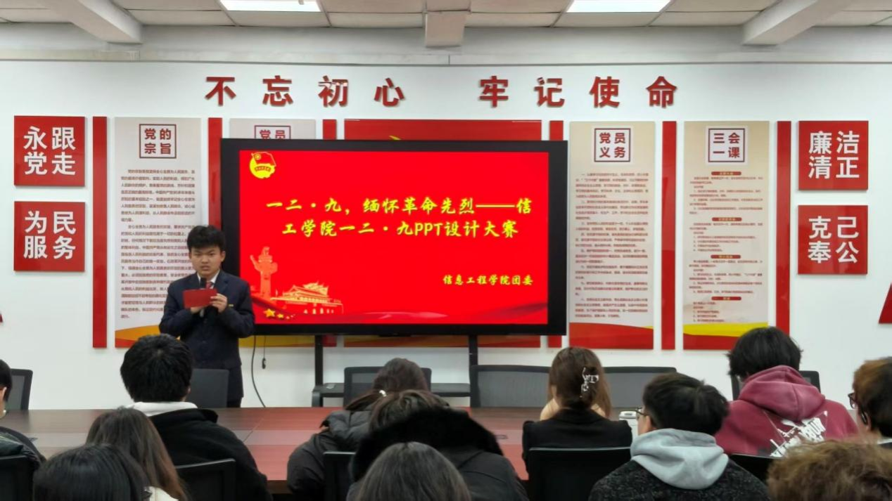 2025年12月9日下午16:15至20:40,信息工程学院于商管楼218开展“一二·九,缅怀革命先烈”PPT设计大赛,以创意设计致敬一二·九运动历史,深入弘扬爱国主义精神,激发青年学子的爱国情怀与时代担当。